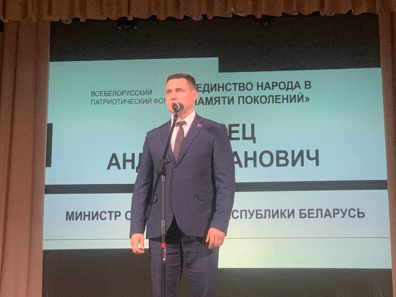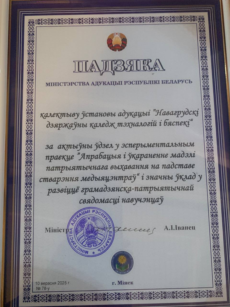 Торжественное собрание Всебелорусского патриотического форума "Единство народа в памяти поколений" состоялось 16 сентября 2025г. в Центральном Доме офицеров. В двухдневном Всебелорусском патриотическом форуме "Единство народа в памяти поколений" приняли участие более 600 гостей и Министр образования Республики Беларусь Иванец Андрей Иванович. В рамках форума представлены лучшие практики в работе с молодежью, результатом которых является формирование гражданской позиции, патриотизма и самосознания. Министр образования вручил награды представителям учреждений , в числе которых и наш колледж.