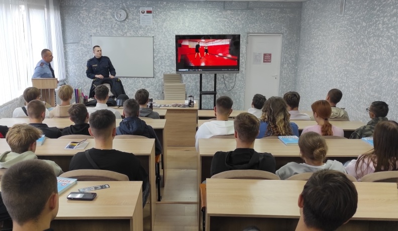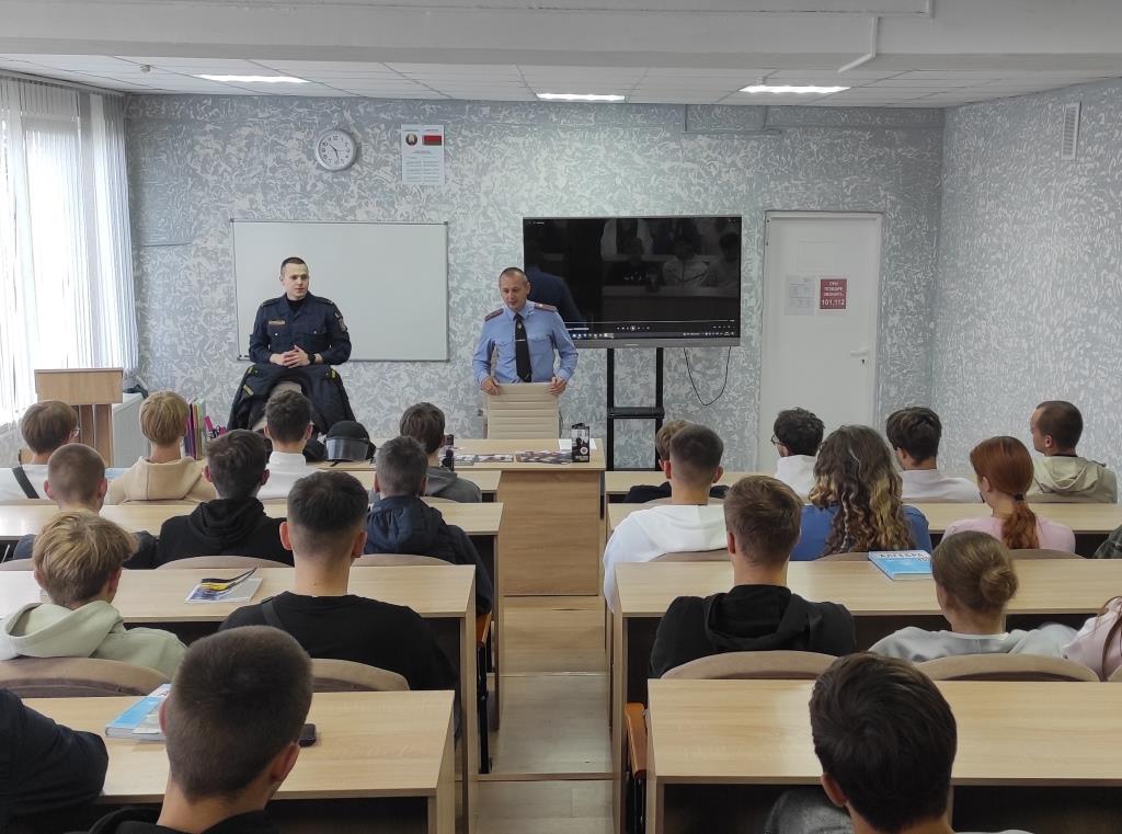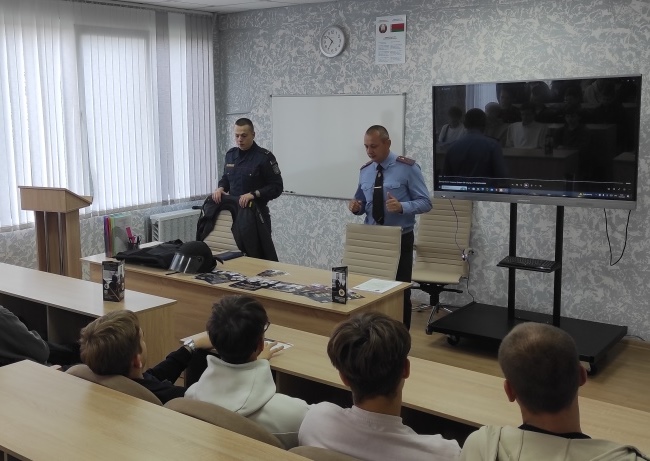 Профориентационное мероприятие с представителями Новогрудского отдела Департамента охраны состоялось в колледже. Помощник начальника по идеологической работе и кадровому обеспечению лейтенант милиции Артюх Роман Юрьевич подробно рассказал о работе сотрудников охраны, о сфере профессиональной деятельности, ознакомил с условиями и требованиями службы, привел примеры из профессионального опыта. Старший инспектор-инженер ГСиСО майор милиции Мармузевич Денис Витальевич провел разъяснение о порядке и условиях поступления в УО «Академия Министерства внутренних дел Республики Беларусь» и УО «Могилевский институт Министерства Внутренних Дел», специальностях, которые можно получить в ВУЗах системы МВД, продемонстрировал ребятам видеоролик.