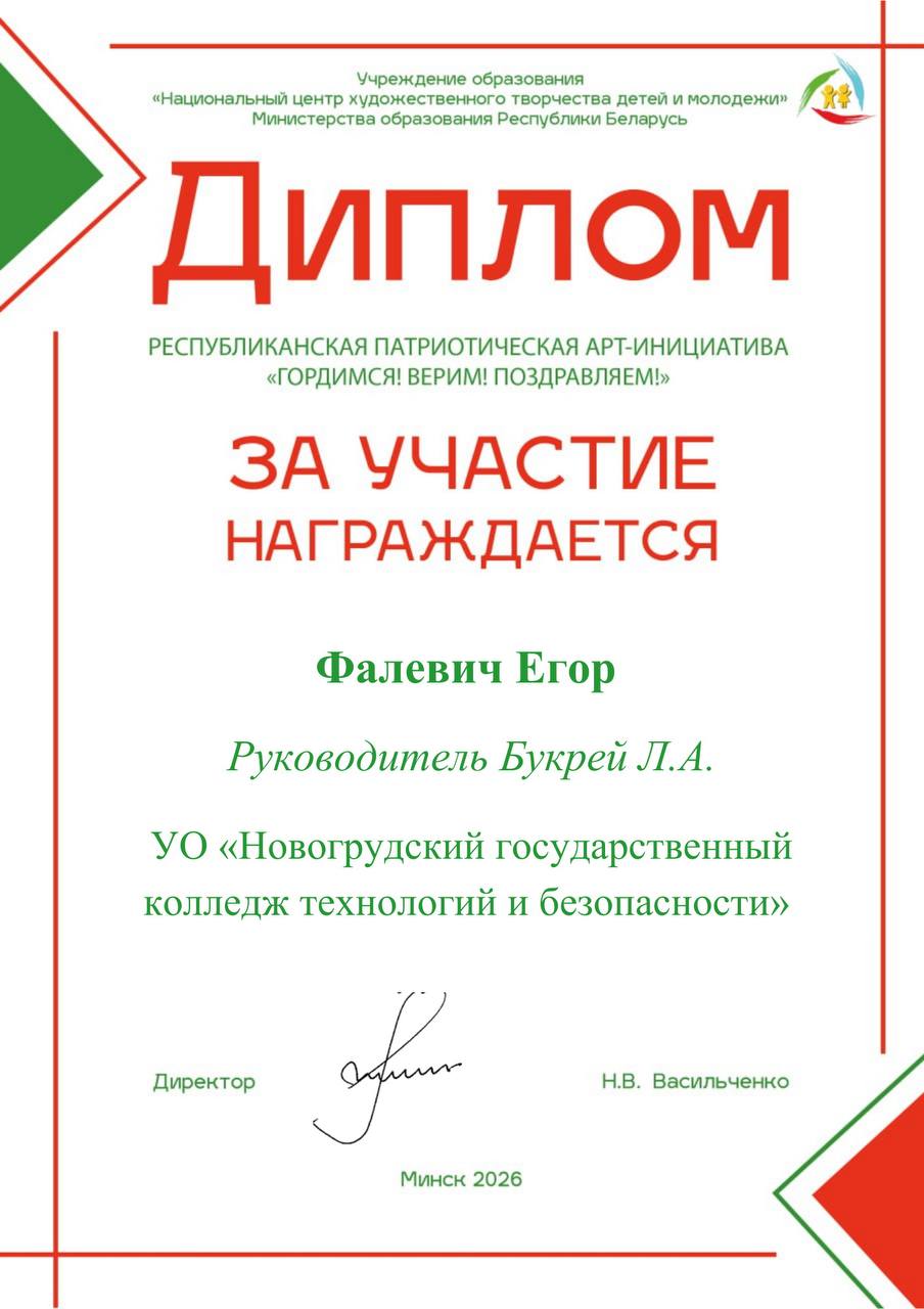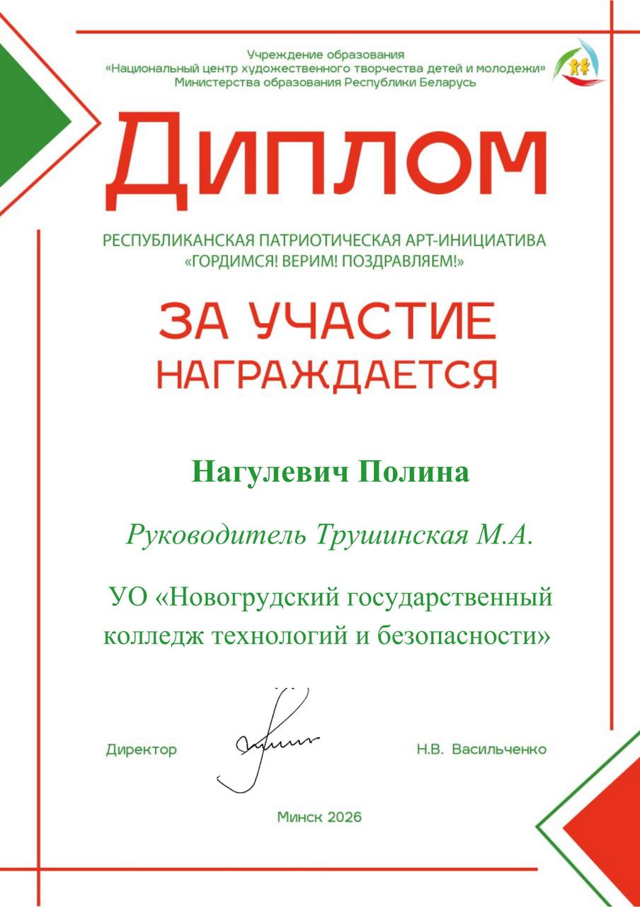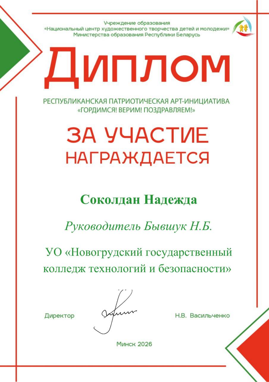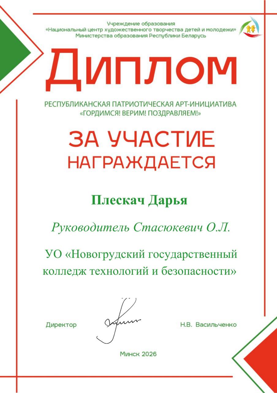 В целях содействия воспитанию гражданственности, товарищества, чувства личной ответственности за выполнение конституционного долга по защите Республики Беларусь, морально-психологической готовности к военной службе, учащиеся колледжа приняли участие в республиканской патриотической АРТ-инициативе «Гордимся! Верим! Поздравляем!», посвящённой Дню защитников Отечества и Вооруженных Сил Республики Беларусь. Лучшие работы отмечены дипломами Национального центра технического творчества, среди которых имена наших учащихся!